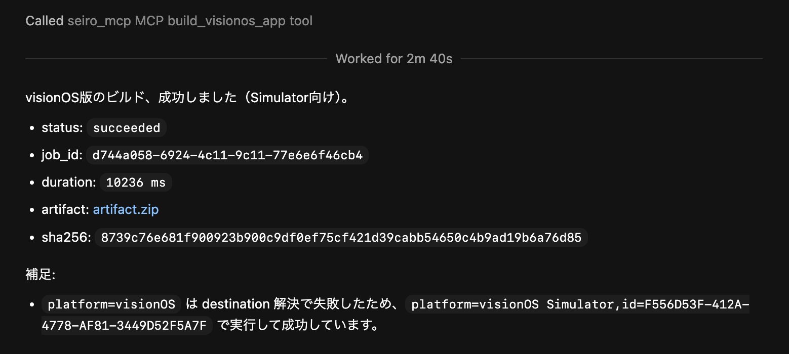 ちっぽけな機能しかない Seiro MCP だけどそれなりに自分の visionOS 向け開発では役に立っててビルドできるか確認し、できない場合自分で修正してくれるというサイクルをサポートできている。